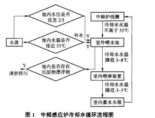 該冷卻系統以潛水泵為動(dòng)力,噴水池和噴淋架為兩級冷卻裝置,以達到中頻爐冷卻水循環(huán)使用的目的。當水溫超過(guò)中頻爐冷卻要求<(55℃)及水量蒸發(fā)損失較多時(shí),則由補水管路及時(shí)補充,同時(shí)及時(shí)排污,保持清潔?!鋮s水池還可為噴水池周邊綠地灌溉,使水資源得到綜合利用。