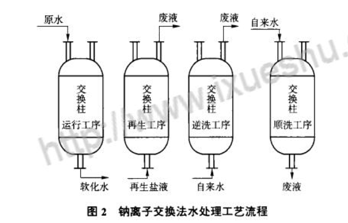 針對上述問(wèn)題,采取了下列解決辦法引入去除了鈣鎂離子的軟化水來(lái)冷卻中頻爐。常用的水處理工藝是鈉離子交換法見(jiàn)圖,其原理是用樹(shù)脂中的鈉離子將水中容易結垢的鈣鎂離子置換出來(lái),減少結垢,提高換熱效率。用酸洗劑加緩蝕劑清洗中頻爐線(xiàn)圈、管路和噴淋架,去除水垢。檢修水泵、閥門(mén)和管路,治理泄漏。