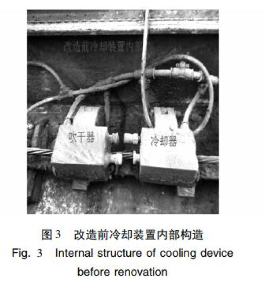 長(cháng)期生產(chǎn)運行中,發(fā)現中頻爐兩端原 裝的冷卻裝置冷卻效果不佳,既影響產(chǎn)品質(zhì)量,又易 造成鋼絞線(xiàn)整根斷裂,存在極大的安全隱患,對人身 和設備造成傷害。 正常生產(chǎn)的鋼絞線(xiàn)經(jīng)冷卻后溫度不高于 60 ℃[4],而經(jīng)中頻爐自帶的冷卻裝置一次自動(dòng)冷卻后 的鋼絞線(xiàn)溫度仍然過(guò)高,約 150 ℃ 左右[5],如果此 時(shí)生產(chǎn)線(xiàn)啟動(dòng),將對此部分鋼絞線(xiàn)進(jìn)行二次加熱,由 于溫度疊加,造成溫度急劇上升,使鋼絞線(xiàn)加熱溫度 過(guò)高,在 30% ~ 50% 抗拉強度的張拉力作用下易造 成鋼絞線(xiàn)整根斷裂。為避免此現象發(fā)生,必須由人 工操作,將中頻爐在位置1 與位置2 之間行走2 至3 次,才能將鋼絞線(xiàn)的溫度降至 60 ℃以下。這樣操作 既浪費時(shí)間也降低生產(chǎn)效率。而且由于需要反復多 次冷卻,中頻爐冷卻器、吹干器等相關(guān)部件使用頻次 增加,維護成本提高。 經(jīng)反復查找,發(fā)現中頻爐原裝的冷卻裝置( 圖 3) 冷卻效果差與其冷卻器( 圖 4) 有關(guān),原設計冷卻器與吹干器為銅制合頁(yè)式交錯咬齒形結構,該設計 存在以下問(wèn)題: ( 1) 采用噴淋式冷卻,冷卻面積小。 ( 2) 冷卻器短,長(cháng)度只有 135 mm。 ( 3) 冷卻水流量小,只有 16 個(gè)直徑為 1 mm 的 出水口。 ( 4) 冷卻器數量少,受設備總體布局的約束,中 頻爐兩端分別有一個(gè)冷卻器。 ( 5) 工作環(huán)境高溫、高油煙,冷卻器出水孔易堵 塞,不能正常工作。 ( 6) 生產(chǎn)線(xiàn)停止運行時(shí),中頻爐由位置 2 向位 置 1 移動(dòng)過(guò)程中,由于鋼絞線(xiàn)沒(méi)有張力,受重力作用 鋼絞線(xiàn)自然下垂造成冷卻器磨損。由于冷卻器結構 復雜難加工,因此制造成本高。