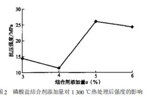 圖1、圖2是以磷酸鹽為結合劑、Al-80水泥為固化劑的四個(gè)配方試樣的性能檢測結果,隨著(zhù)結合劑添加量的增大,110℃×24h烘干后澆注料試樣的抗壓強度呈上升趨勢,但在≤4%和≥5%的添加量范圍內,隨結合劑添加量的增加試樣的抗壓強度增大幅度很小,而在4%~5%的范圍內,抗壓強度隨結合劑添加量的增加而急劇提高。對于經(jīng)1300℃熱處理后的試樣,結合劑添加量在≤4%和≥5%的范圍內,試樣的抗壓強度隨結合劑的增加而呈微弱的下降趨勢,但抗壓強度隨結合劑添加量的增加而急劇提高。綜合可見(jiàn),對于本實(shí)驗選擇的原材料與實(shí)驗范圍內,磷酸鹽結合劑合理的添加量為4%~5%。
