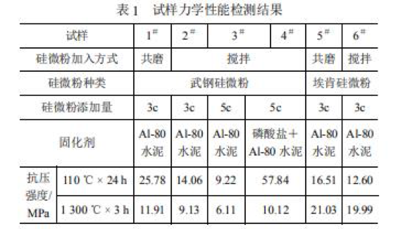 表1是以不同種類(lèi)、不同添加量的硅微粉為結合劑和以磷酸鹽、Al-80水泥為固化劑的澆注料力學(xué)性能檢測結果。由表1可見(jiàn),硅微粉的種類(lèi)、加入方式、添加量以及固化劑種類(lèi)對試樣的力學(xué)性能影響較大。由1#、2#試樣和5#、6#試樣的檢測結果可見(jiàn),與硅微粉的直接攪拌加入方式相比,共磨加入方式能明顯改善澆注料的力學(xué)性能。由3#、4#試樣的檢測結果可見(jiàn),固化劑種類(lèi)對澆注料性能影響較大,并可看出磷酸鹽與Al-80水泥組成的復合固化劑具有明顯改善修補料性能的效果,而Al-80水泥則效果不明顯。由2#、3#試樣的檢測結果可見(jiàn),硅微粉添加量的提高未能提高澆注料的力學(xué)性能。由采用相同的加入方式而硅微粉來(lái)源不同的1#、5#和2#、6#試樣的檢測結果可見(jiàn),??瞎栉⒎叟c武鋼硅微粉相比,能明顯改善澆注料熱處理后的力學(xué)性能,并且添加??瞎栉⒎鄣臐沧⒘峡箟簭姸入S試樣的熱處理溫度的提高而不斷增大。綜合可見(jiàn),宜采用??瞎栉⒎圩鳛殒V質(zhì)澆注料的結合劑,合適的添加量應為3c%左右。