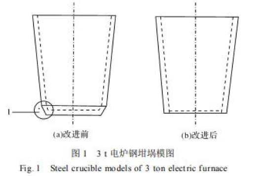 3t中頻爐鋼坩堝模具的原始設計如圖1(a)所示。它是由兩個(gè)截短的空心錐體組成的鋼制坩堝模具。這種結構的鋼制坩堝模具在建造熔爐時(shí)具有一個(gè)缺點(diǎn),即,(1)部分中的死砂不易結實(shí),并且容易引起鐵水泄漏。改進(jìn)的鋼制坩堝模具的形狀如圖1(b)所示,它是帶有截頭空心錐的鋼制坩堝模具。這種改進(jìn)有助于在熔爐制造過(guò)程中打結。沒(méi)有死角,從根本上解決了原始鋼制坩堝模具的打結(1)不易打結的問(wèn)題。實(shí)踐證明,這種改進(jìn)是非常成功的,并且是延長(cháng)爐齡的關(guān)鍵之一。